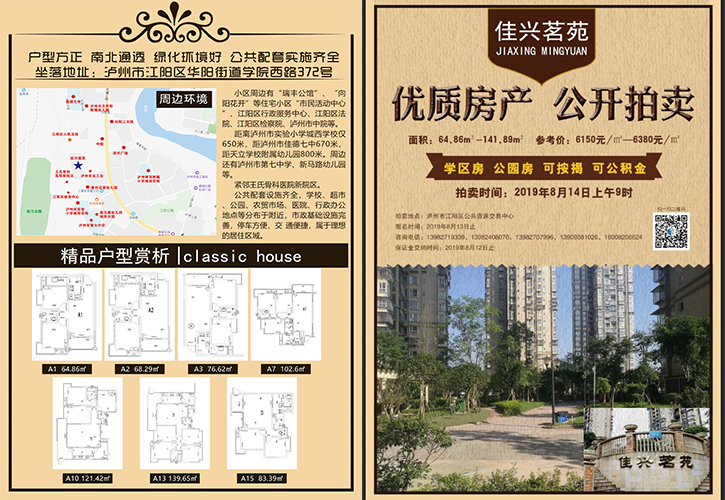 一、拍賣標(biāo)的:坐落于瀘州市江陽區(qū)華陽街道學(xué)院西路372號(hào)“佳興茗苑”小區(qū)第一批次住房。(詳見房屋清單)